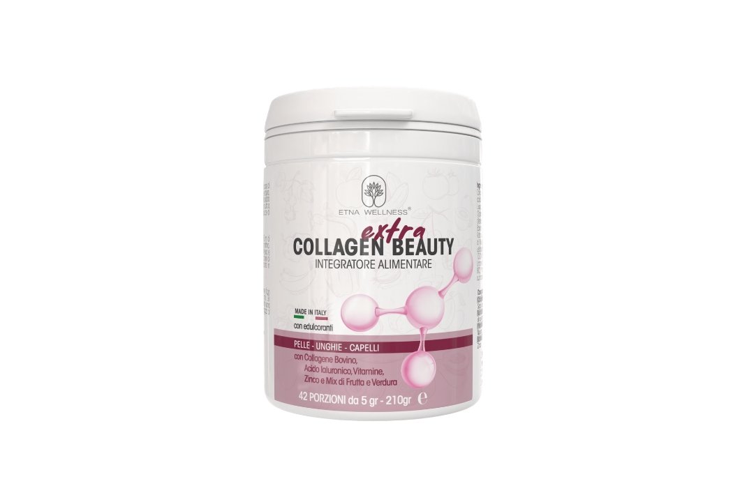COLLAGEN EXTRA BEAUTY è un supplemento nutrizionale formulato con collagene marino di alta purezza specificamente studiato per supportare la bellezza e la salute della pelle favorendo elasticità idratazione e contrasto dei segni dell’invecchiamento cutaneo. Il collagene di origine marina è particolarmente affine alla struttura del collagene umano garantendo elevata biodisponibilità e assorbimento ottimale. È considerato tra le fonti più pure ed efficaci. Il prodotto agisce dall’interno per nutrire la pelle a livello profondo dove creme e trattamenti topici non riescono ad arrivare supportando la produzione naturale di collagene dermico. Il collagene è la proteina strutturale che conferisce alla pelle compattezza ed elasticità e l’integrazione aiuta a mantenere la pelle tonica elastica e dall’aspetto giovane. Supporta la capacità della pelle di trattenere l’idratazione contribuendo a mantenerla morbida levigata e idratata dall’interno. L’integrazione con collagene contrasta i segni visibili dell’invecchiamento cutaneo: rughe linee sottili perdita di tono e di volume aiutando a mantenere un aspetto giovane e radioso. I peptidi di collagene stimolano i fibroblasti della pelle a produrre nuovo collagene acido ialuronico ed elastina rinnovando i tessuti dall’interno. La formula è potenziata con vitamina C (essenziale per la sintesi del collagene) acido ialuronico biotina e antiossidanti (vitamina E coenzima Q10) per un’azione completa sulla bellezza.